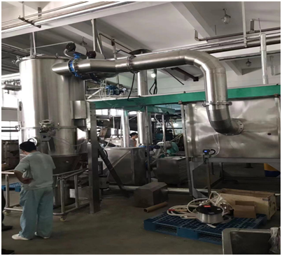 氮氣循環(huán)沸騰干燥機由空氣過濾器,空氣加熱器,干燥床,制粒噴槍、分離室,過濾室,排風(fēng)管、引風(fēng)機、煙囪、控制系統(tǒng)等組成。