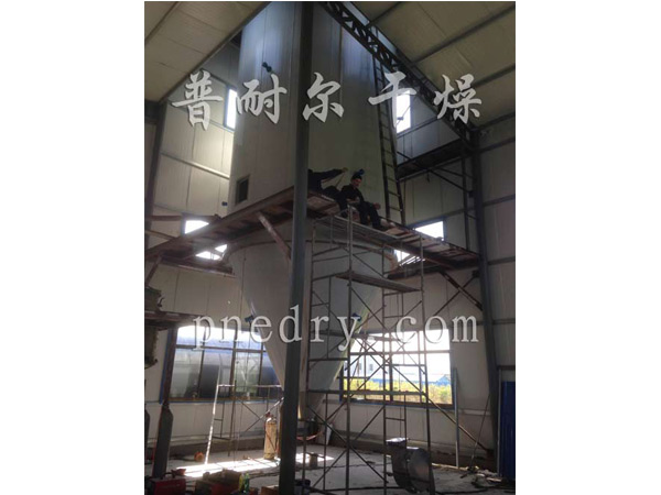 空氣經(jīng)過濾空氣表面制冷,進(jìn)入干燥器頂部空氣分配器,熱空氣呈螺旋狀均勻的進(jìn)入造粒塔。料液經(jīng)塔體頂部的造粒霧化器,霧化成液珠,塔體形成順流與逆流在形成混流氣流,增加傳熱效率,與冷空氣并流接觸在極短的時(shí)間內(nèi)可固化干燥為成品。成品連續(xù)地干燥塔底部和旋風(fēng)分離器中輸出,廢氣由風(fēng)機(jī)排空。